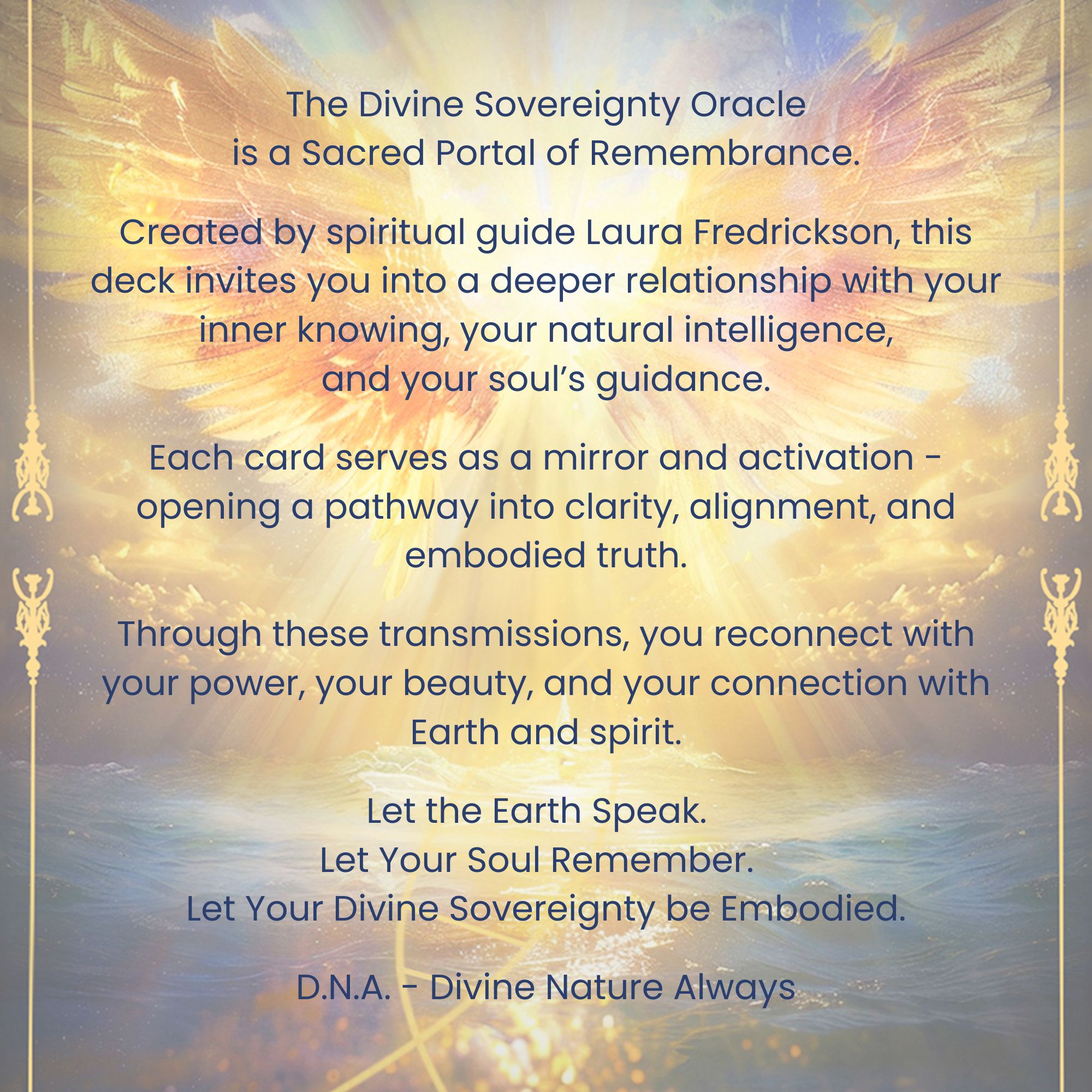 The Divine Sovereignty Oracle is a portal to your sacred remembrance—a reflection of the natural world and the divine intelligence encoded within your D.N.A. (Divine Nature Always).
